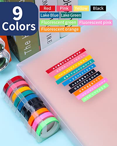 10 pezzi compatibile colorato 3D Dymo goffratura nastro per Dymo Omega Junior Organizer espresso goffratura stampanti manuali di etichette. l Colore: bianco su nero/rosso/rosa/giallo/blu lago/verde lago/verde fluorescente/rosa fluorescente/organo fluorescente l Dimensioni: 9 mm x 3 m ciascuno