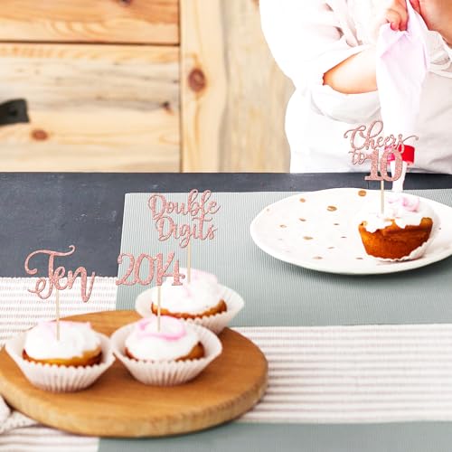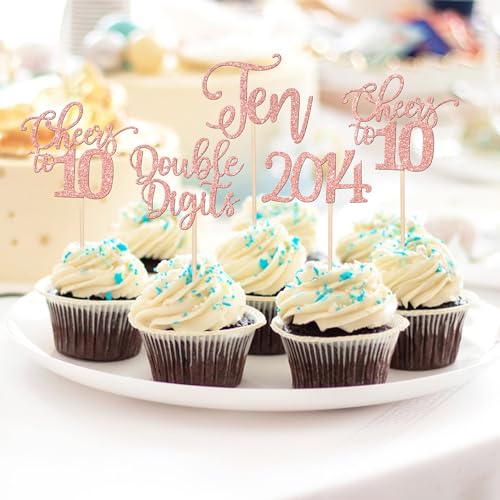 24 PZ 10° compleanno Cupcake Toppers Glitter Dieci dal 2014 Double Digits 10 Cupcake Picks Ciao 10 anni Decorazioni per torte di compleanno per il 10° compleanno anniversario festa oro rosa