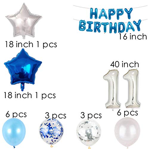 Set di decorazioni per il 11° compleanno: 13 bacchette con scritta "Happy Birthday", ghirlanda di palloncini blu, 1 rotolo di nastro decorativo, 6 palloncini in lattice bianco (6 pollici), 3 palloncini trasparenti con coriandoli blu (12 pollici), 1 palloncini blu a stella (18 pollici). 1 palloncino da 40 pollici, 1 palloncino in pellicola digitale color argento, 1 palloncino da 40 pollici, 1 palloncino in lamina argentata a stella (18 pollici), 3 palloncini trasparenti con coriandoli in argento