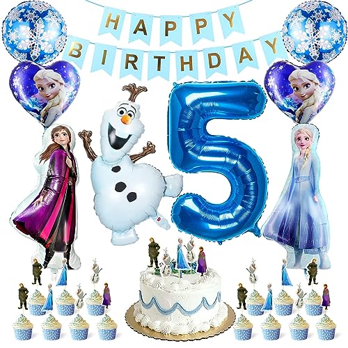 Compleanno Decorazione per 5 Anni Ragazza,34PCS,2 Rotondo Palloncini di Alluminio,2 Cuoriforme Palloncini,2 Principessa Palloncini di Alluminio,1 Pupazzo di Neve Palloncini,24 Torta Toppers
