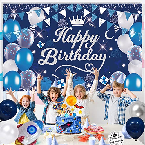 Compleanno Decorazioni Striscione, Blu Navy Argento Happy Birthday Striscione Extra Lungo Poster Sfondo Fotografico Compleanno Feste Addobbi Decorazioni Palloncini Uomo Decorazione Banner 190X120cm