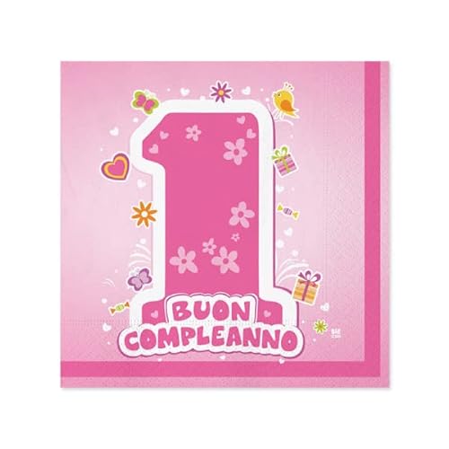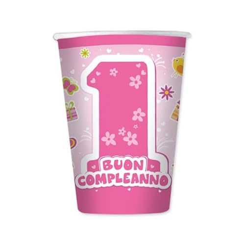 Set Compleanno 1 Anno Rosa/Fucsia Completo di: 8 Piatti a Forma di 1, 20 tovaglioli, 8 Bicchieri