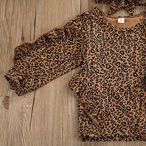 Completo Bambina 3 Pezzi Felpa Leopardato Pullover Manica Volante Lunga con Pizzo+Pantaloni Lunghi con Pizzo con Fiocco Leopardato+Fascia Fiocco Leopardata (Marrone, 6-12 Mesi)