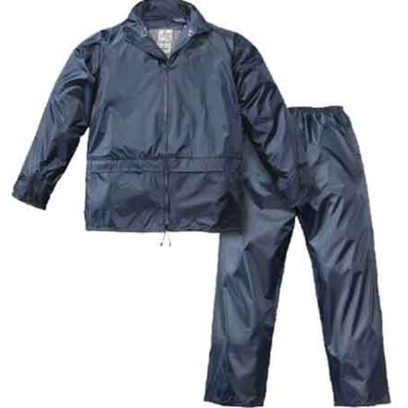 In poliestere spalmato internamente in PVC, peso 200 g/mý. GIACCA: Cappuccio fisso a scomparsa, chiusura con cerniera, due tasche con patta antipioggia in vita. PANTALONE: elastico in vita, due tasche laterali passamano, bottoni automatici alle caviglie. Completo giacca e pantalone impermeabile 200 gr tg. m - colore blu Impermeabili
