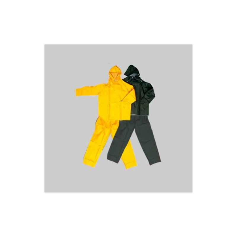 In PVC-poliestere-PVC, peso 390 g/mý. GIACCA: cappuccio fisso, chiusura con cerniera ricoperta da patta e bottoni automatici, due tasche sul davanti con patta antipioggia, fondo manica con elastico stringipolso. PANTALONE: elastico in vita, apertura frontale con bottone automatico, bottoni automatici alle caviglie. Completo giacca e pantalone impermeabile 390 gr tg. xl - colore verde Impermeabili