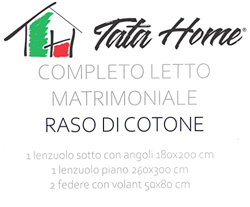 COMPLETO LETTO MATRIMONIALE dalle dimensioni generose: Lenzuolo sotto con angoli elastici misura 180x200 cm altezza materasso 25 cm - Lenzuolo sopra misura 260x300 cm - Coppia federe misura 50x80 cm con patella di 10 cm e volants di 4 cm.