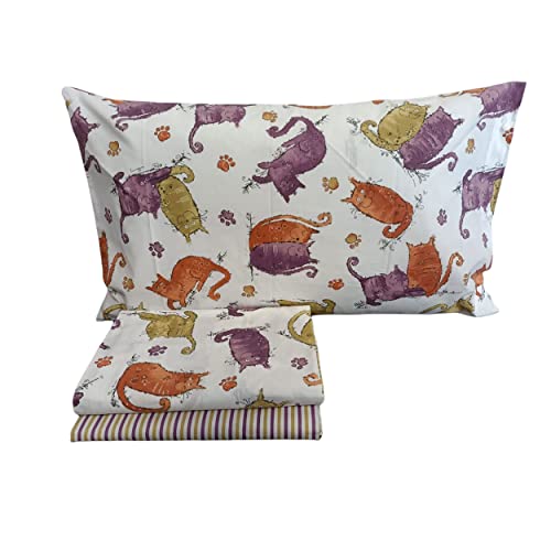 Completo letto lenzuola matrimoniale singolo 1 piazza e mezza GATTONI MICI GATTI (MATRIMONIALE, VIOLA)