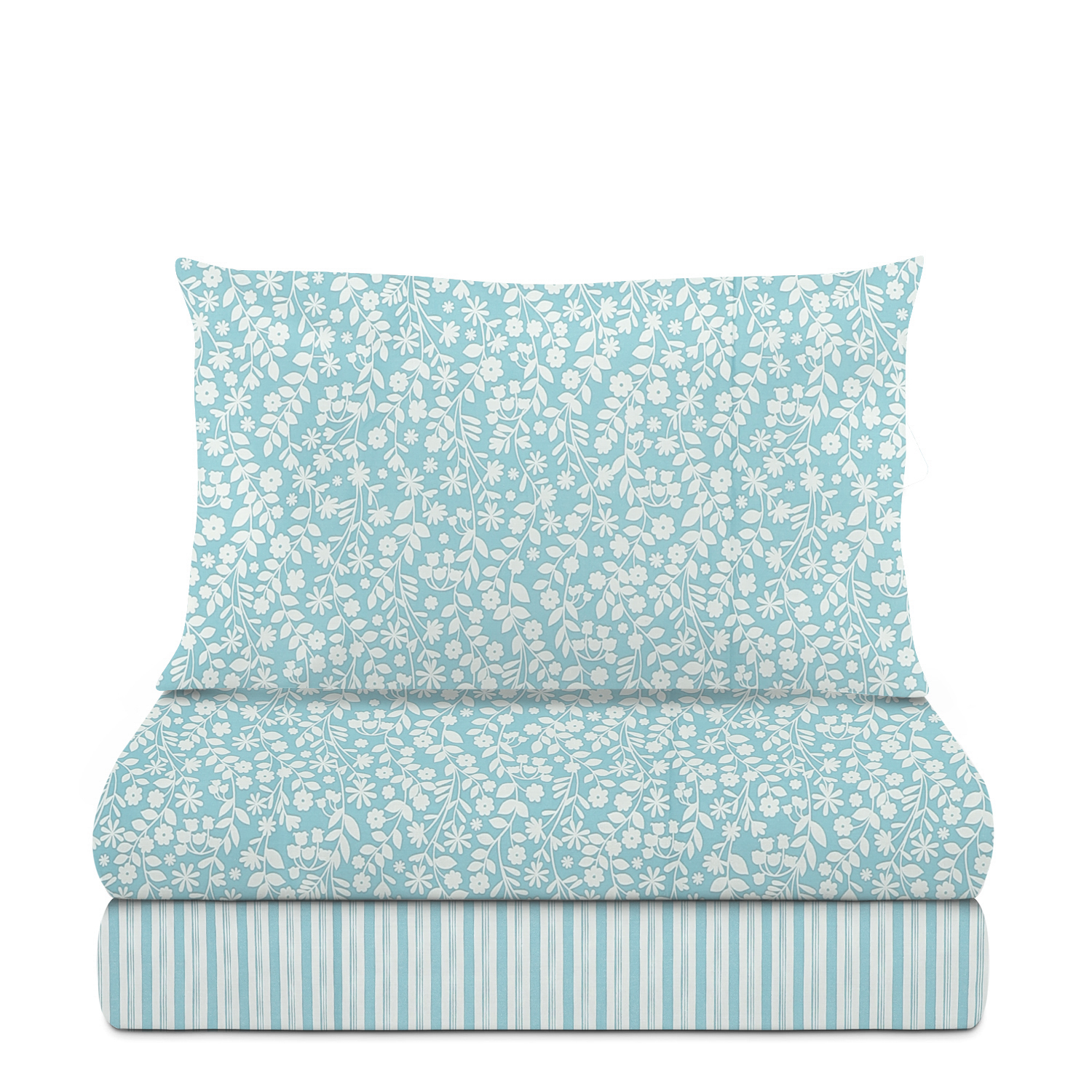 Vesti la tua camera da letto con tessuti soffici, avvolgenti e di qualità: scegli il completo letto Cabana nella versione con stampa floreale e a righe azzurro, in 100% cotone. Il coordinato per letto singolo è completo di lenzuolo con angoli (90x200 + altezza angolo 23 cm), lenzuolo piano (150x280 cm), federa (50x80+15 cm). Lavabile in lavatrice a 40°.
