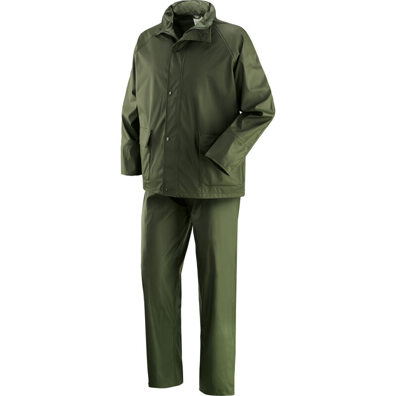 GIACCA Peso 170 g/m2 Spessore 0,35 mm Cappuccio fisso a scomparsa con coulisse Aerazione sul dorso e sotto le ascelle Chiusura con cerniera e bottoni automatici Soffietto antivento nella manica 2 tasche con patta antipioggia PANTALONI Peso 170 g/m2 Spessore 0,35 mm Elastico in vita 2 tasche laterali passamano con cerniera Apertura frontale con bottoni automatici Bottoni automatici alle caviglie Colore: verde