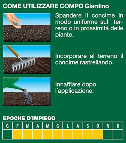 Modalità d'uso: 1- distribuire il concime in modo uniforme sul terreno, 2- incorporare al terreno rastrellando, 3- annaffiare dopo l'applicazione