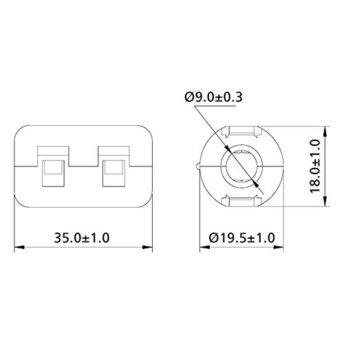 5 mm · Dati tecnici complementari: Materiale: RF75 · Gamma di Ø cavo: 9 mm (max) · Impedenza a 100 MHz: 160 Ω · Impedenza a 25 MHz: 80 Ω · Lunghezza: 35 mm · Modello: a scatto · Tipo (tipo produttore): TC-KFR90 · Tipo induttività (categoria): Ferrpsite able · Ø cavo (max.