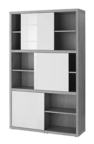 Libreria a dodici vani, con struttura color cemento e ante scorrevoli laccate bianche lucide della linea Pratico. Versatile e moderna, è adatta ad arredare la sia la camera da letto che il soggiorno o l'ufficio.