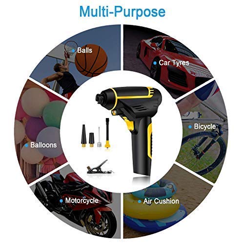 Pompa ad aria multifunzione: la pompa ad aria portatile offre 5 ugelli di ricambio per auto, camper, scooter, SUV, moto, biciclette, camper, tosaerba, materassi ad aria, gommoni, palloni ecc. Il gonfiaggio completo di un pneumatico da bicicletta vuoto richiede circa 3 minuti, pneumatici da moto circa 4 minuti, pneumatici per auto circa 6 minuti.
