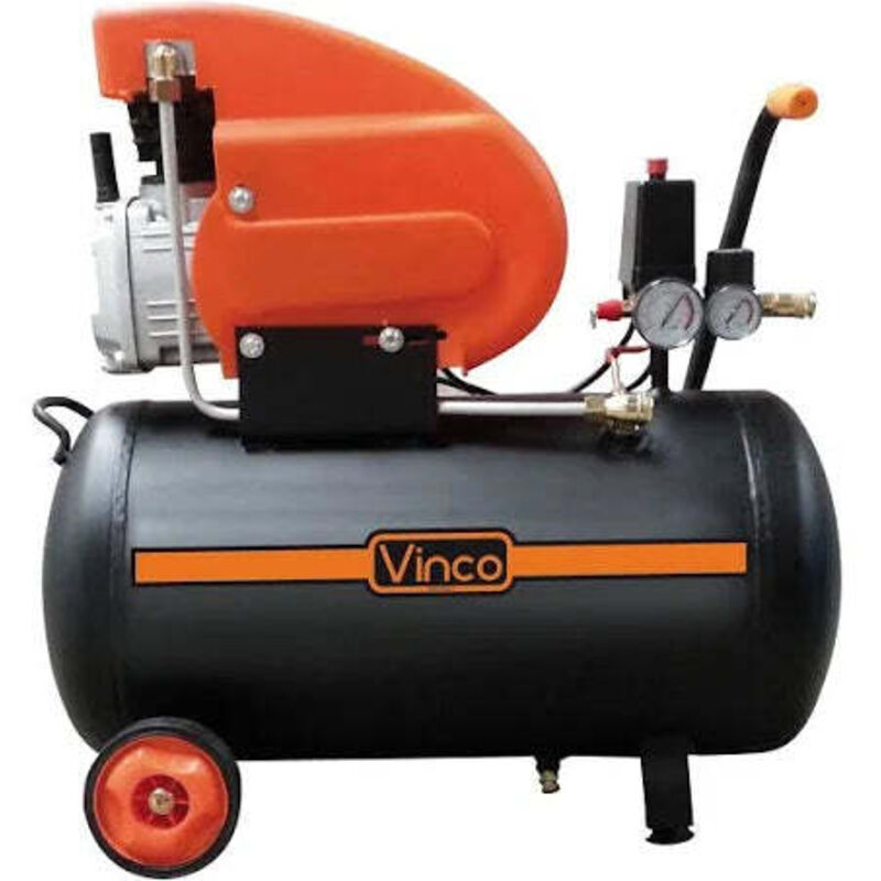 Compressore ad Olio Vinco 50 lt Vinco: Cod. 60601/ Mod. FDL50 Compressori Vinco da 50Litri Lubrificato, Munito di doppio Manometro, Trattamento anticorrosione, Ruote e maniglia per trasporto. Dati tecnici: Capacità serbatoio: 50 Litri / Spessore 2.5 mm Rumorosità (misurata): 76 Db Pressione: 8 bar Potenza: 2,0 Hp Aria aspirata: 188 l/m Tensione / voltaggio: 230V / 50 Hz Giri per minuto: 2850 rpm Dimensioni prodotto: 70x32x65 cm Peso netto/lordo: 31/32 Kg Caratteristiche: Doppio manometro per il controllo immediato della pressione in entrata e in uscita Trattamento anti corrosione del serbatoio e valvola di spurgo nel lato inferiore per operazioni di pulizia ordinaria Doppio attacco uscita aria per poter lavorare con due elettroutensili contemporaneamente 2 ruote posteriori in gomma e maniglia in metallo per agevolare gli spostamenti 2 Piedini Anteriori Tasto Accensione / Spegnimento