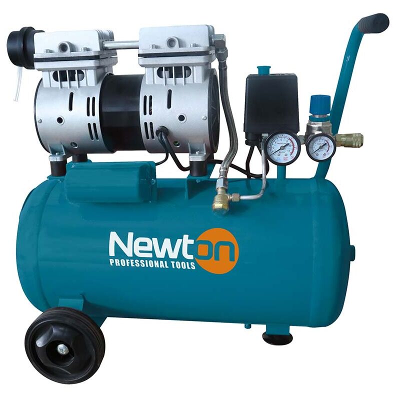 Il compressore d'aria silenziato NEWTON SUPERSILENT con serbatoio orizzontale e gruppo pompante montato superiormente, è munito di 2 ruote, maniglia per la movimentazione e tampone antivibrante per la stabilità in funzione, è robusto e performante, ideale per tutti i lavori di verniciatura e soffiatura, oltre che per l'utilizzo di utensili pneumatici leggeri. Indicato per gli hobbisti più esigenti. Motore a bassissima rumorosità solo 59 db, SENZA olio >. Il compressore Newton silenziato è dotato di doppio manometro di lettura, con riduttore di pressione e pressostato elettromeccanico di protezione da sovraccarico DATI TECNICI Alimentazione 230V~50Hz Potenza motore 0,75 HP / 550 KW Giri motore 1440 Pressione di esercizio 8 bar Volume serbatoio 24 Litri Aria aspirata 110 litri/min Rumore Livello LWA in dB (A) 59 Classe protezione IP20 Peso lordo 21 Kg Due uscite ad attacco rapido