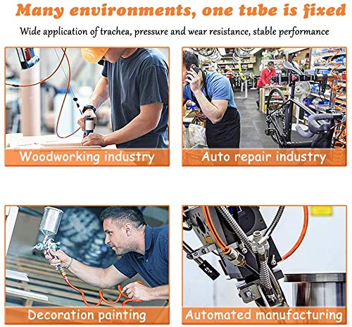 Viene fornito con raccordi a innesto rapido e limitatori di curvatura: installato 1/4 "resistente accoppiatore rapido industriale e spina per un comodo contatto con compressore d'aria e utensili d'aria. I limitatori di piegatura riducono la piega e aiutano ad aumentare la durata del tubo. L'accoppiatore rapido e la spina possono essere rimossi da una chiave.