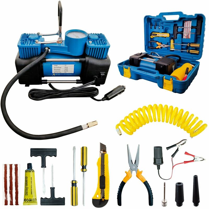Mini compressore a doppio cilindro Il mini compressore a doppio cilindro è un prodotto versatile e pratico che può essere utilizzato per gonfiare pneumatici di veicoli, biciclette, moto, camper, camion, gommoni e palloni. Grazie al doppio cilindro, questo compressore è in grado di raggiungere una pressione massima di 150 PSI, rendendolo ideale anche per gonfiare pneumatici di camion e furgoni. Il funzionamento è semplice e intuitivo: basta collegare i morsetti alla batteria dell'auto e collegare il tubo flessibile al pneumatico da gonfiare. Il manometro integrato permette di monitorare la pressione in tempo reale. Il mini compressore è realizzato in materiale di qualità, è resistente e durevole nel tempo. Il design portatile e la valigetta per il trasporto lo rendono facile da trasportare e riporre. Caratteristiche tecniche: Manometro fino a PSI Cavo di alimentazione di circa 3 metri Alimentazione: 12V 15A Pressione massima: 150 PSI Flusso d'aria: 85 L/min Consumo energetico: 300W