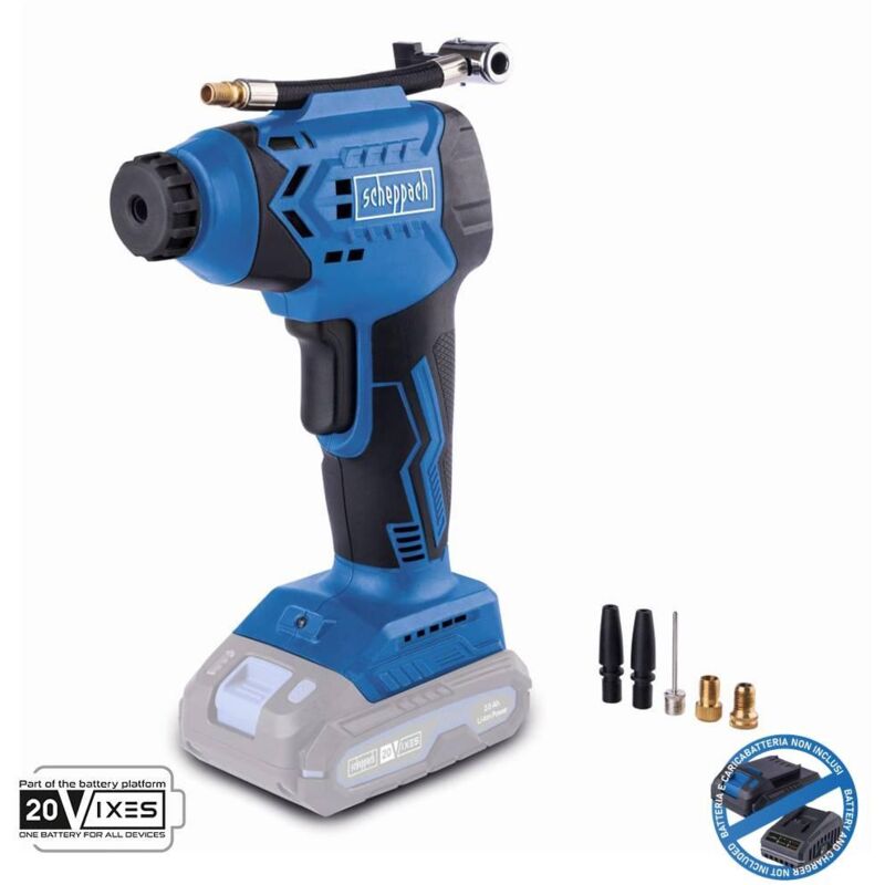 Con una pressione di esercizio massima di 7 bar, il compressore manuale a batteria Scheppach C-AC20-X è un pratico e potente aiuto da portare in viaggio ed è ideale per gonfiare pneumatici di biciclette, palloni o materassi ad aria. Il display LCD mostra la pressione di esercizio attuale e preimpostata in bar o PSI. Quando viene raggiunta la pressione preimpostata, il compressore si spegne automaticamente. Come parte della serie Scheppach IXES da 20 volt, tutte le batterie e i caricabatterie della serie di sistemi possono essere combinati con il compressore manuale. Batteria e caricabatterie sono disponibili separatamente. - Compressore manuale a batteria compatto e potente per la libertà senza fili in movimento - Ideale per gonfiare pneumatici di biciclette, giocattoli e articoli sportivi - Funziona senza fili con la serie Scheppach IXES da 20 volt: tutte le batterie e i caricabatterie della serie di sistemi possono essere combinati con il compressore manuale a batteria - Pressione