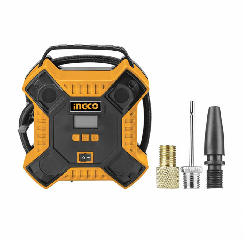 Voltaggio: 12V Pressione massima: 160PSI / 11 Bar / 1100Kpa Flusso d'aria max: 35L / min Con luce LED Con cavo 3M per accendisigari Adattatore a sfera, adattatori per pneumatici Con 1 adattatori per gonfiabili Confezionato in scatola.