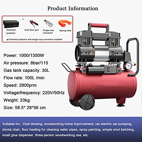WUK Compressore d'Aria Senza Olio 1000/1300 W Compressore d'Aria Portatile Silenzioso (40dB) 30L Vernice Spray Odontoiatria 220V Pompa d'Aria per officine Utensili Pneumatici