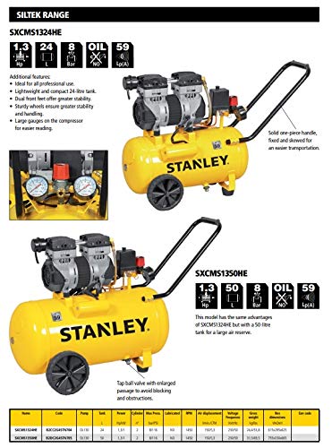 COMPRESSORE SILENZIATO SENZA OLIO STANLEY LT.24 - 1,3 HP - 8 BAR - 1500 WATT - 230 V