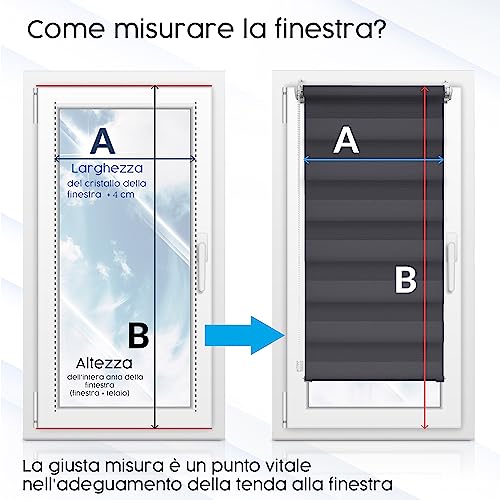 TENDE AVVOLGIBILI DOPPIE PERSONALIZZATE: Misura con precisione l'ampiezza della tua finestra per un ordine perfetto. Consigliamo di aggiungere da 2 a 4 cm all'ampiezza del vetro per una copertura adeguata. Seleziona la lunghezza della tua tenda avvolgibile considerando l'altezza totale della finestra, ovvero il vetro della finestra + la cornice. Per finestre inferiori a 150 cm, scegli la misura da 150 cm. Per finestre più grandi, opta per l'opzione da 220 cm per garantire una copertura totale.