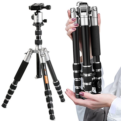 【PORTATILE】Il treppiede fotografico è tanto leggero( con il peso solo di 1.2kg) grazie al materiale di lega di alluminio, la lunghezza da chiuso solo di 33cm per le gambe con 5 sezioni sono pieghevoli fino a 180 gradi. Con la borsa inclusa è molto conveniente portare fuori il treppiede per le attività all'aperto.