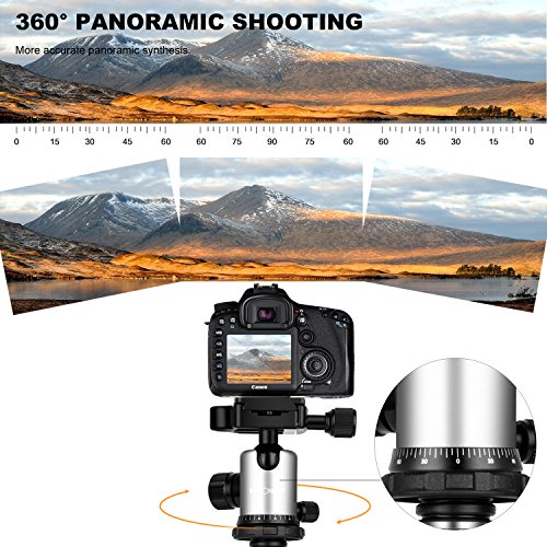 【TESTA A SFERA】La sfera con il diametro di 28mm mogilora la stabilità della piastra, lo smorzamento senza olio permette che la fotocamera gira più correntamente e precisamente. 360 gradi con la scala è perfetto per l'intera ripresa panoramica. E' necessario acquistare un anello di monttaggio del treppiede o una staffa di teleobiettivo se installa la fotocamera con teleobiettivo.