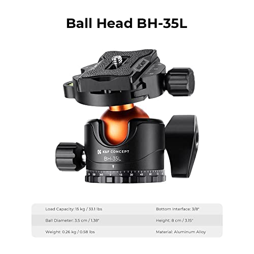 【360°Riprese Panoramiche】 La testa a sfera K&F Concept da 35 mm ha un carico massimo di 15 kg e un design ammortizzante senza olio in grado di soddisfare le esigenze di riprese panoramiche a 360°. Dotata di un sistema di sgancio rapido compatibile con la maggior parte delle piastre Arca-Swiss, la vite da 1/4" può adattarsi alla maggior parte delle fotocamere, DSLR, proiettori e telescopi, ecc.