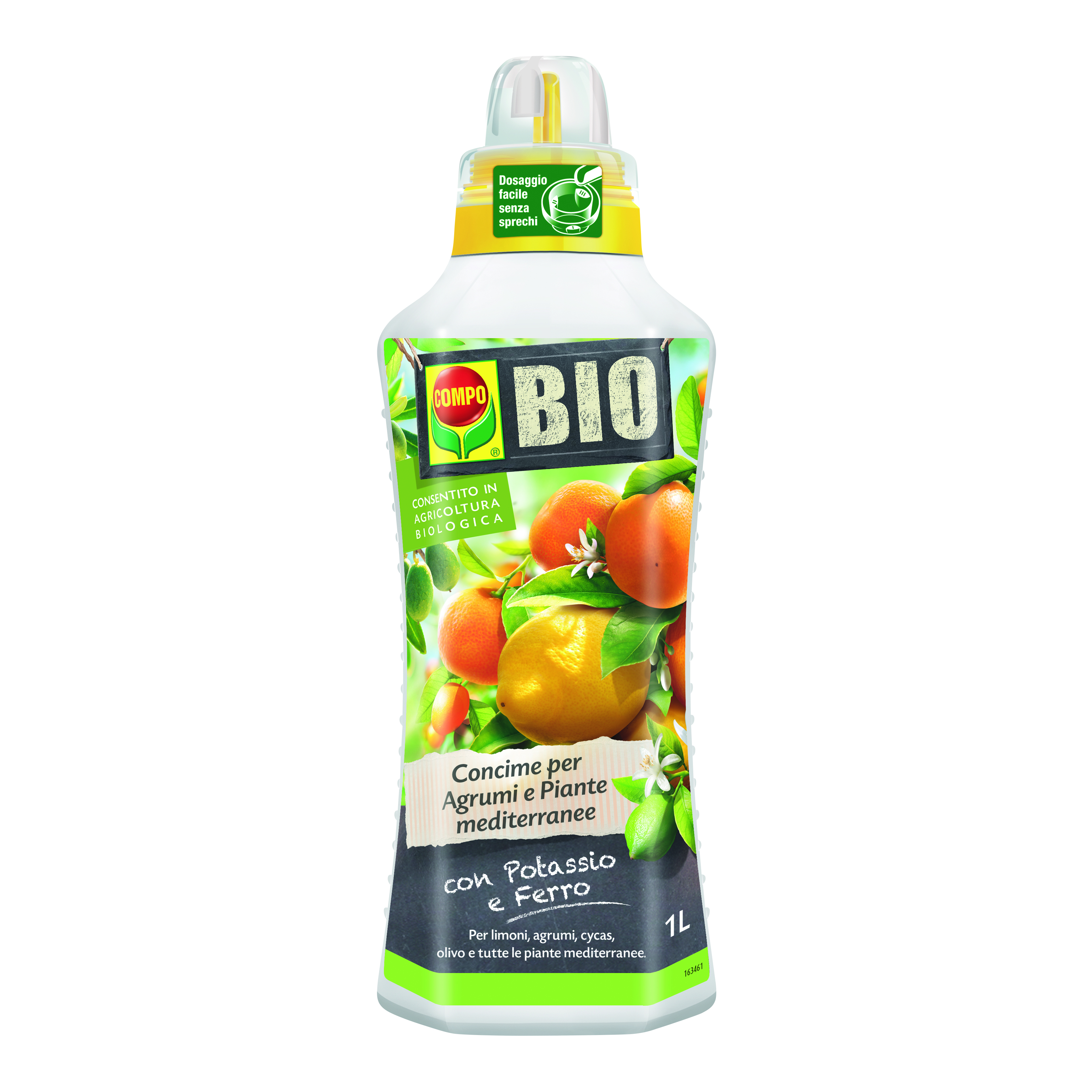 Concime completamente naturale specifico per agrumi e per tutte le piante mediterranee sia in vaso che piena terra, quali: limone, arancio, mandarino, kumquat ma anche piante mediterranee quali l'olivo. A base di borlanda vegetale ricca di azoto e potassio per migliorare la pezzatura dei frutti Modalità d'uso: Riempire il tappo dosatore con il liquido fino alla tacca indicata Diluire la quantità consigliata in acqua Annaffiare con la soluzione ottenuta alla base della pianta Dosaggio: Tacca I in 1 litri d'acqua Tacca II in 1,5 litri d'acqua Tacca III in 2 litri d'acqua Numero applicazioni: Da marzo a ottobre concimare ogni 7-10 giorni. Questa bottiglia è composta la 90% da plastica riciclata. Dosaggio facile senza sprechi: tappo graduato con salvagoccia. Ideale per limone, mandarino, cedro, olivo, palmette. Concime liquido per agrumi e piante mediterranee. Sviluppo sano ed equilibrato delle piante, fioriture e fruttificazioni intense. Ricco di potassio e ferro
