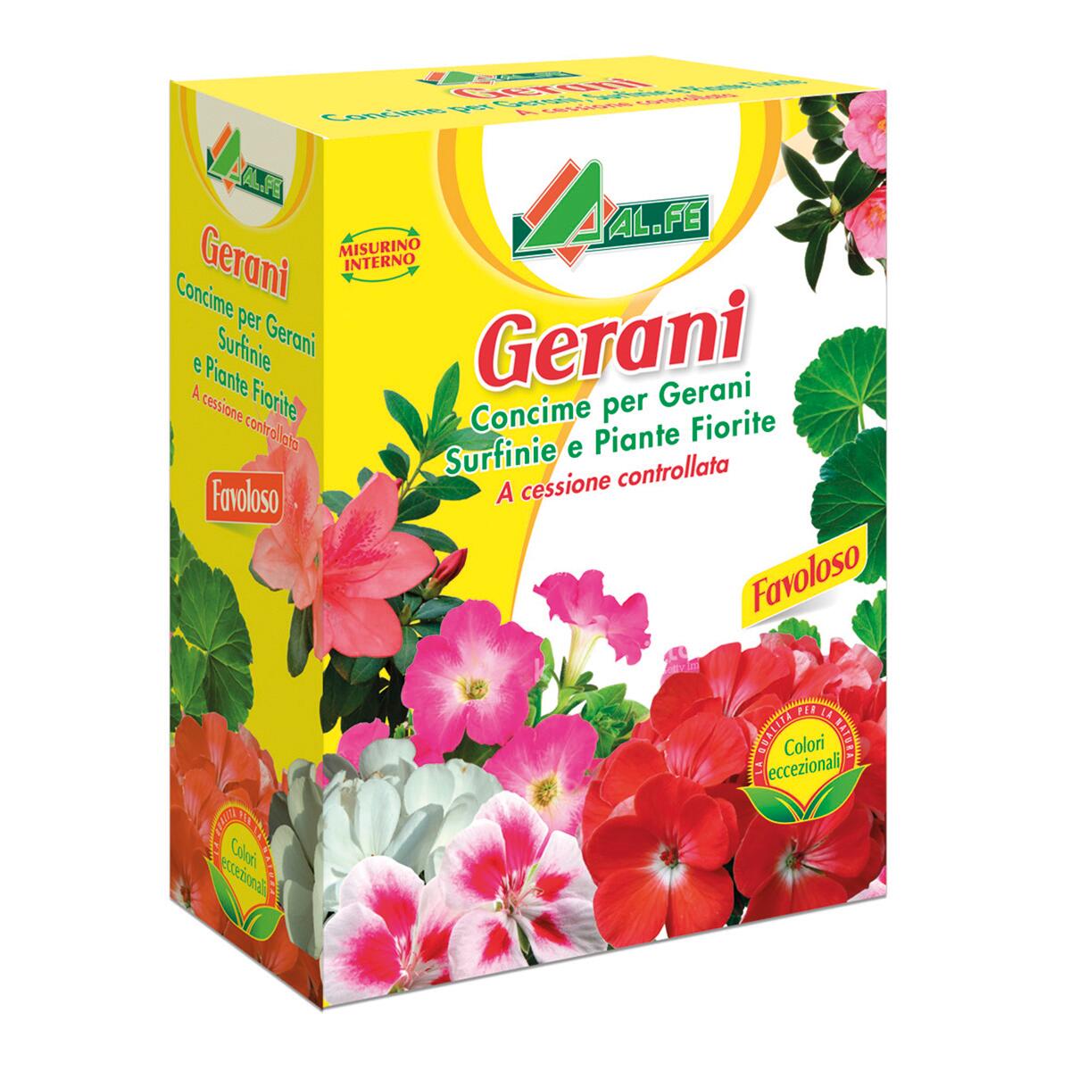 Concime granulare specifico per tutte le specie di gerani e di piante fiorite in vaso o in piena terra. La sua particolare formulazione, a cessione programmata, permette un rilascio graduale degli elementi nutritivi durante tutta la fase vegetativa, garantendo una crescita rapida e rigogliosa delle piante, fioriture abbondanti, colorate e durature nel tempo. La presenza di Magnesio rende la vegetazione di colore verde brillante.. Facile da usare: 15 g (mezzo misurino) per vasi di 24 centimetri di diametro. Ideale per gerani, surfinie e piante fiorite.. Concime minerale composto NPK 12-6-12 (Mg) (2) a basso tenore di cloro ideale per Gerani e piante da fiore. Il particolare titolo nutrizionale garantisce fioriture abbondanti. A lento rilascio graduale in tutta la fase vegetativa