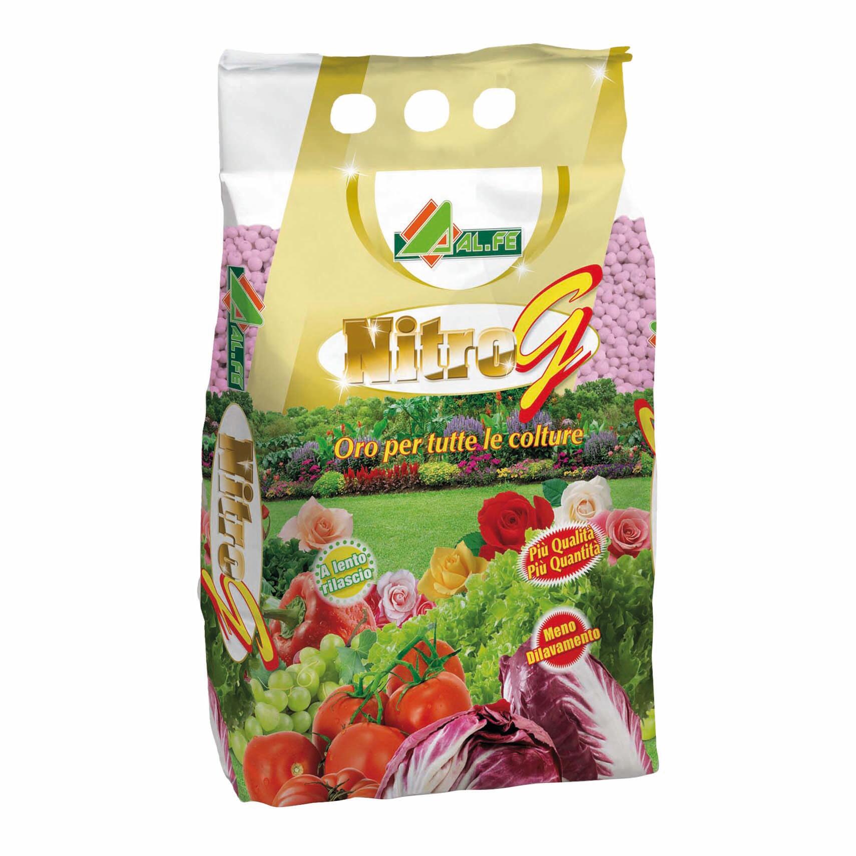 NITRO G, è il concime che grazie alla sua elevata concentrazione di elementi concimanti è il nutrimento ideale e completo per la maggioranza delle piante da giardino (ornamentali in genere), da orto (pomodori, peperoni, legumi, zucchine, insalate, piante aromatiche ed ortaggi in genere), fruttifere e tappeti erbosi. La sua ricca formulazione permette di ottenere rigogliose vegetazioni, fiori e frutti abbondanti, ricchi di colore e sapore. Le differenti forme azotate consentono di avere frazioni di azoto prontamente disponibile ed una a cessione programmata, per rilascio graduale dell'azoto, evitando i fenomeni di dilavamento (dovuto alle irrigazioni ed alle piogge), garantendo un apporto di elementi nutritivi costante e produttivo durante il periodo vegetativo della pianta.. Ideale per tutte le colture che hanno bisogno di una concimazione completa. Facile da usare: Alla ripresa vegetativa: 30 - 60 g. per mq.In fioritura e concimazioni successive: 30 g. per mq.. CONCIME NPK (MgO) (SO3) 15-9-15 (2) (20) A cessione controllata. Completo e a lenta cessione a base di Isodur. Concime per tutte le colture