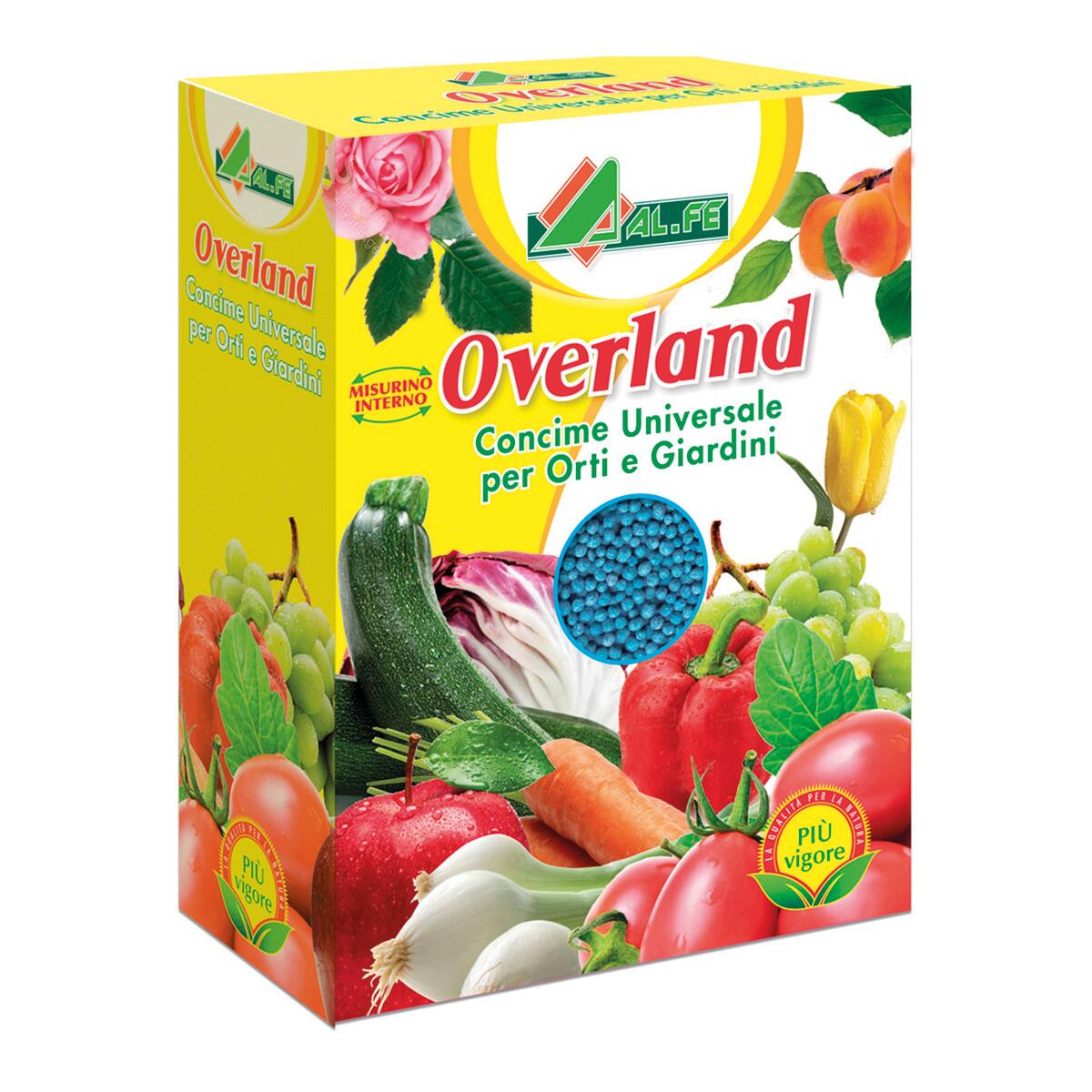 Overland è il nutrimento completo per tutte le piante verdi, fiorite, orticole e da frutto. La sua formulazione specifica conferisce vitalità alle colture in genere, permette di ottenere una rigogliosa crescita fogliare con conseguenti abbondanti e prolungate fioriture e fruttificazioni. Favorisce inoltre la colorazione e la profumazione dei fiori.. Facile da usare: 15 g (mezzo misurino) per vasi di 35 centimetri di diametro. Ideale per tutte le colture nell'orto e sul balcone. Concime CE NPK 12-12-17 con Zinco (Zn) Blu per tutte le colture. Formulazione ricca di azoto, fosforo e potassio. Formulazione granulare, pratica ed efficace