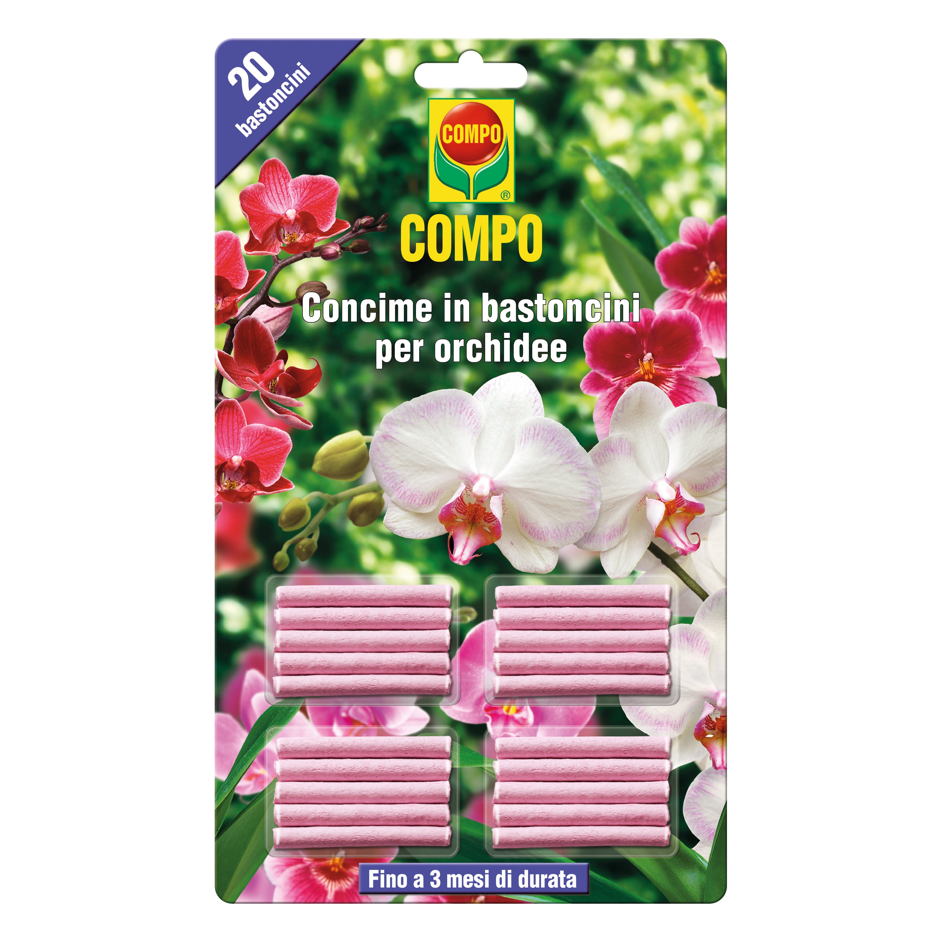I bastoncini per Orchidee sono un concime specifico di facile utilizzo. Ogni bastoncino contiene i principali macro e microelementi. Hanno una durata notevole: fino a 3 mesi. Contribuiscono a rendere le fioriture delle orchidee lunghe e rigogliose. Modalità d'uso: Identificare una zona dove poter inserire il concime in bastoncini per orchidee COMPO senza danneggiare le radici e ricoprire. Procedere poi con le regolare annaffiature. Da marzo a ottobre concimare ogni 3 mesi. Da novembre a febbraio dimezzare le dosi. Azoto a lenta cessione in forma di urea formaldeide per una concimazione prolungata fino a 100 giorni.. Ideale per tutti i tipi di orchidee in vaso. Fioriture delle orchidee lunghe e rigogliose. Evitano errori di dosaggio e distribuzione del prodotto. Concime specifico con macro e microelementi