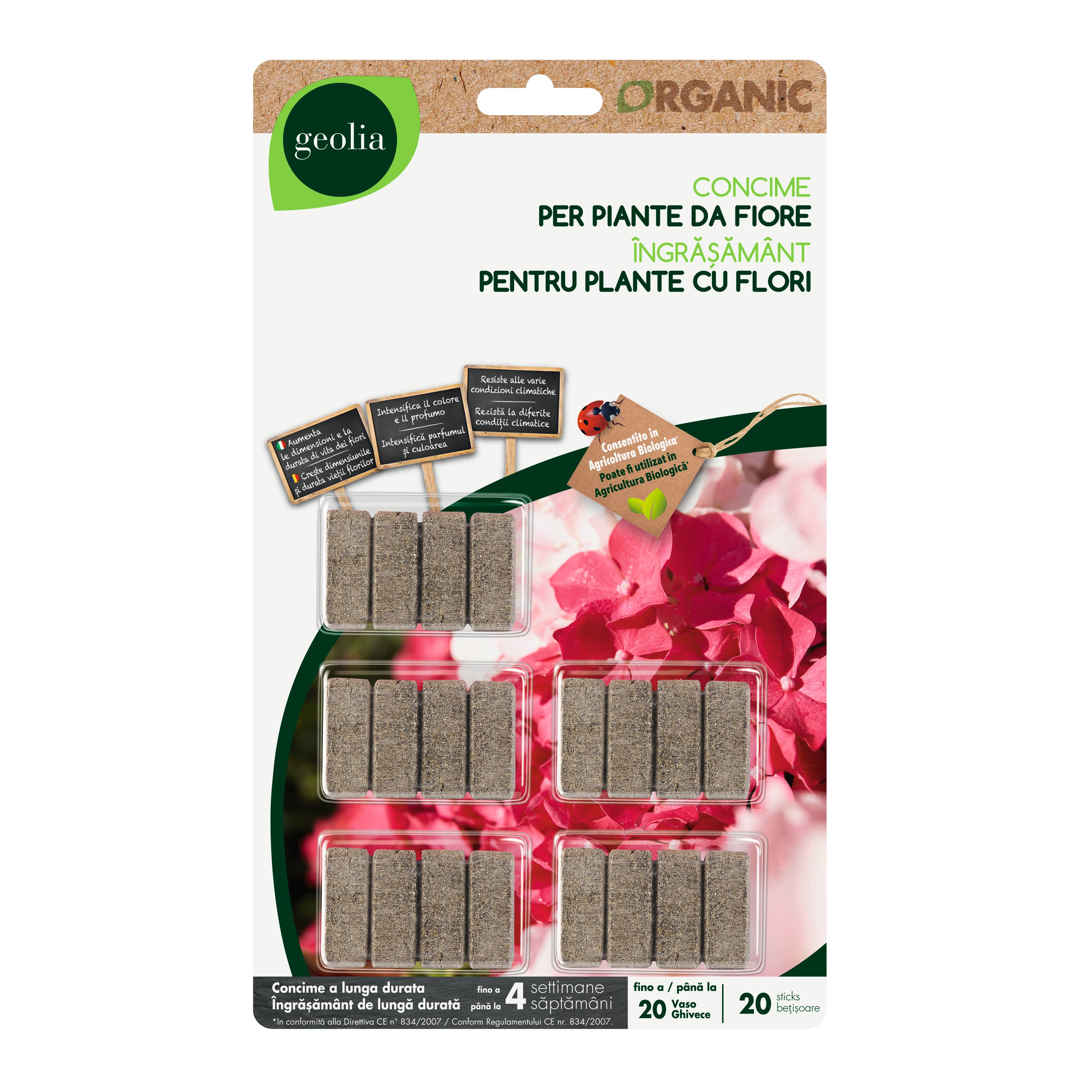 Il concime in bastoncini apporta alle piante in vaso tutti gli elementi nutritivi minerali e naturali indispensabili per una corretta crescita e uno sviluppo armonioso. Sono convenienti e sicuri, in quanto evitano errori di dosaggio e distribuzione del prodotto. 100% naturali e consentiti in agricoltura biologica. Modalità d'uso: Crea un piccolo foro nella terra ad una distanza di 5-6 cm dal gambo della pianta, inserire un bastoncino, ricoprirlo con il terriccio ed annaffiare. Da marzo a settembre ogni 2 mesi. Lasciare riposare durante l'inverno.. Pronto all'uso