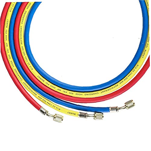 L'aria condizionata indicatore diagnostico refrigerante includono 3 ricarica freon tubi di cinque piedi in 3 colori per un facile riconoscimento, che sono di colore rosso per alta pressione, blu per bassa pressione e di colore giallo per la bottiglia di refrigerante
