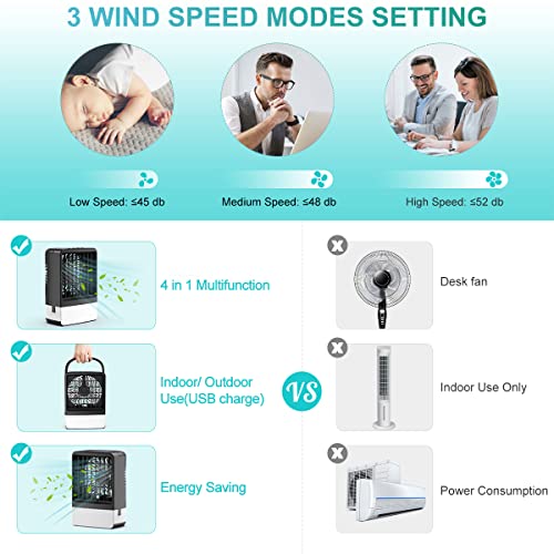 ❄【Design Multifunzione 5 in 1 Migliorato】Questo raffreddatore d'aria evaporativo può essere utilizzato come ventilatore portatile, ventilatore a nebbia per umidificatore, mini condizionatore d'aria, purificatore d'aria e luce notturna a LED. L'aggiunta di cubetti di ghiaccio al serbatoio non solo abbassa la temperatura, ma aiuta anche a tenerci lontani dall'aria secca e riduce allergeni, polvere e fumi.