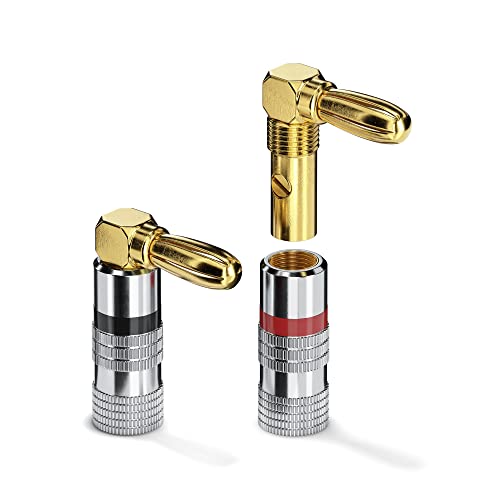 Conecto connettori a banana per cavi altoparlanti, set di 4, spina angolata a 90°, placcati oro con codifica a colori (2x rossi, 2x neri), placcati oro 24k