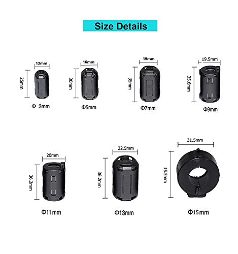 Confezione da 20 clip ad anello antirumore per cavi, per interferenze radio ed elettromagnetiche (RFI, EMI), in ferrite, colore nero, diametro cavi 5 mm / 7 mm / 9 mm / 13 mm
