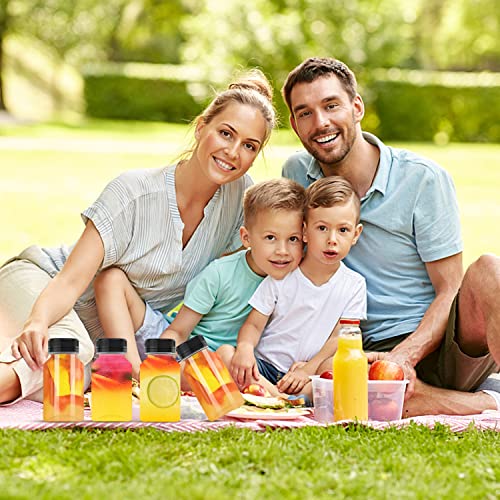 Confezione da 8 bottiglie di succo di plastica con 1 etichetta di frutta, contenitore trasparente per bevande, bottiglie di succo con coperchio nero, per conservare succo, latte, frullato