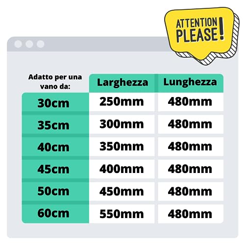 ✅ La misura 250x480mm è adatta per un vano da 30 cm, quella 300x480mm per uno da 35cm, 350x480mm per uno da 40cm, 400x480mm per uno da 45cm, 450x480mm per una da 50cm e quello da 550x480mm per uno da 60cm.