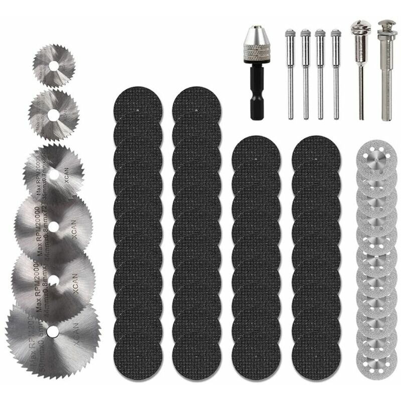 Disco da taglio in resina da 40 pezzi Realizzato in resina di alta qualità e la superficie ha un design a doppia rete, che rende il disco da taglio non facile da riscaldare, la linea di taglio va bene, applicabile a trapani elettrici, levigatrici sospese, levigatrici elettriche, eccetera. Possono essere utilizzati per il taglio di metallo, plastica, modifica del telaio, circuiti metallici fini e produzioni fai-da-te. . 6 lame circolari HSS: realizzate in acciaio super rapido e con 6 diametri da 22/25/32/35/44/50 mm, adatte per il taglio di legno, prodotti in plastica, leghe di alluminio, metallo tenero, eccetera. . Set di 10 dischi da taglio diamantati In diamante, diametro del disco da taglio: 22 mm, diametro del mandrino: 3 mm. Perfetto per tagliare pietre preziose, vetro, ceramica, porcellana, piastrelle, metallo duro, roccia, alluminio e rame. I migliori strumenti fai da te Con questo set di 3 tipi di dischi da taglio misti, dotato anche di un mandrino universale, puoi tagliare