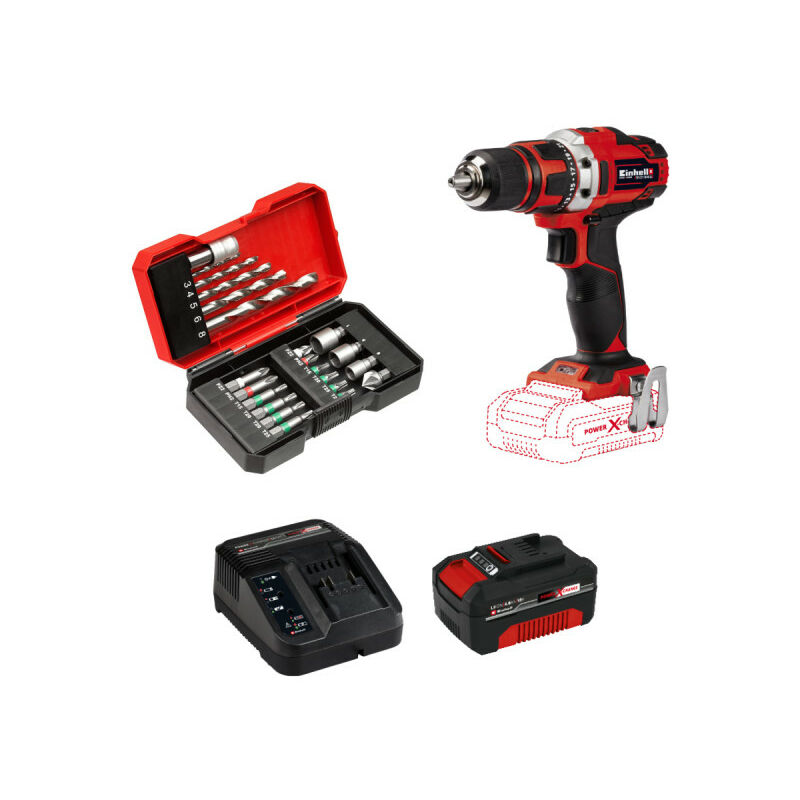 Presentazione: La confezione EINHELL comprende un trapano/avvitatore 18/40 Li-Solo, uno strumento indispensabile per i lavori di avvitamento e foratura. Il cambio a 2 velocità garantisce un lavoro efficiente e il controllo elettronico della velocità consente di adattarsi al materiale e all'uso desiderato. Il mandrino a manicotto singolo da 13 mm può essere regolato con precisione su 21 coppie diverse, facilitando la scelta dell'accessorio giusto. Il comfort operativo è ottimale: un LED integrato mantiene illuminata l'area di lavoro e il design ergonomico assicura un'ottima presa. L'utensile viene fornito con lo Starter Kit Power 4.0Ah, che comprende una potente batteria ricaricabile da 4.0 Ah e un caricatore rapido. Questo kit è compatibile con tutti gli utensili della gamma Power X-Change. Infine, il set di accessori per trapani e avvitatori EINHELL - 49108806 contiene una serie di punte compatibili con tutti i trapani/avvitatori (esagonali da 1/4). Einhell è un marchio tedesco