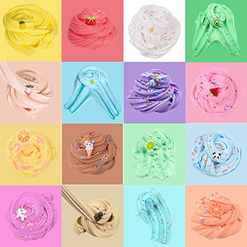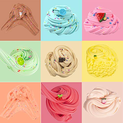 ★ Multi-colore a scelta: 24 pezzi di melma colorato, accessori melma includono: arcobaleno, unicorno, gelato, alcuni frutti, animali, caramelle, alcuni sacchetti di frutta in plastica e crumble al cioccolato. Il muco ha abbastanza provviste. Facile da giocare per i bambini.