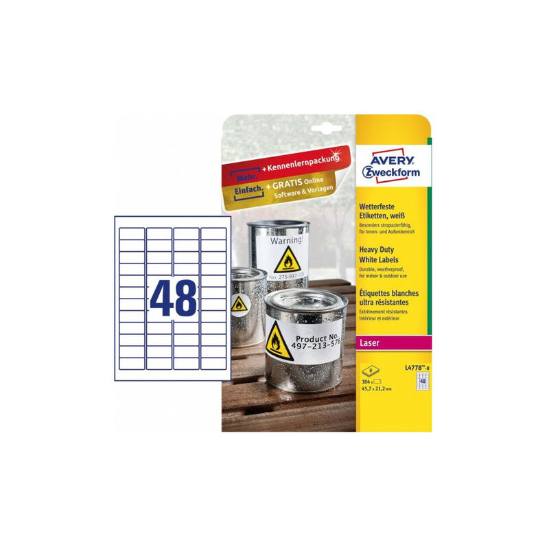 Altre caratteristiche: Altezza: 21,2 mm Larghezza: 45,7 mm Etichette per foglio: 48 pezzo/i Etichette per confezione: 384 pezzo/i Forma: Rettangolo arrotondato Formato: DIN A4 Fogli di supporto per confezione: 8 fogli Stampabile: Sì Materiali: Poliestere Intervallo di temperatura (T-T): -20 - 80 °C Resistente agli agenti atmosferici: Sì Resistente allo sporco: Sì Resistente ai raggi ultravioletti (UV): Sì Resistente agli oli: Sì Resistente all'acqua: Sì Resistente agli strappi: Sì Tecnologia di stampa: Laser Tipo di adesivo: Permanente Tipo di confezione: Blister Tipo di finitura: Opaco