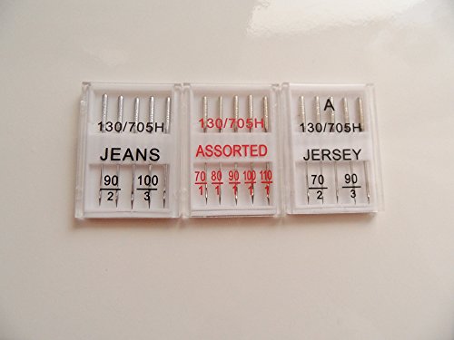 Confezione da 15 aghi a gambo piatto, universali, per macchina da cucire, per jersey/jeans/tessuti assortiti