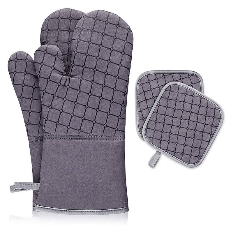 I guanti da forno in cotone siliconico sono foderati con una spessa fodera in spugna che li rende altamente resistenti al calore. Confezione da 4 guanti da forno Premium - Set di 4 4 vani: 1 paio di guanti e 2 guanti da forno per una maggiore sicurezza in cucina. Questo set di presine premium è un ottimo regalo per una moglie o una madre. Design antiscivolo: il design in silicone stampato offre una presa sicura e antiscivolo quando si impugnano pentole e padelle. Grazie al suo materiale rinforzato, i guanti da forno offrono una protezione aggiuntiva ideale per le mani contro il calore molto elevato. 【Facile da riporre e pulire】 I nostri guanti da forno hanno un design con fibbia che ti consente di appendili sul tuo armadietto o sul barbecue. È lavabile in lavatrice e lavabile a secco. Risparmia spazio e mantieni la tua cucina più pulita. 【Guanti da forno in diverse aree di applicazione】I guanti da forno sono perfetti per uso interno ed esterno. Possibili aree di utilizzo sono ad es.