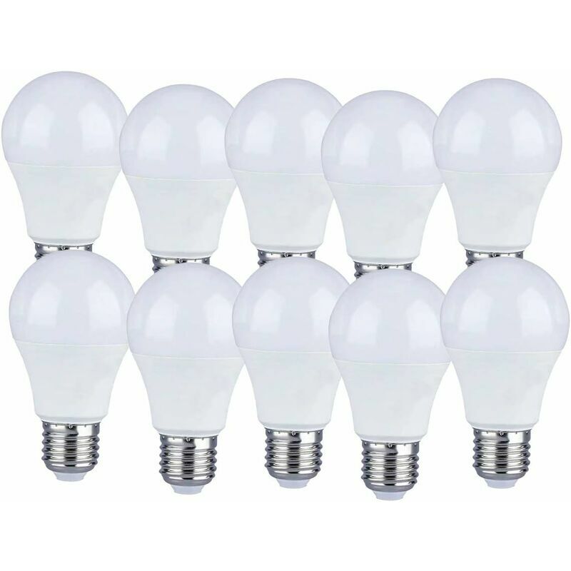 LED E27 con attacco grande 200 V A60 Consumo: solo 9 W (equivalente a una lampada a incandescenza da 60 W) Dimensioni (Ø x H): 60 x 110 mm Angolo del fascio luminoso: 200° . Alta luminosità di 806 lm. Confezione da 10 lampadine.