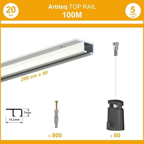 Sistema TOP-Binario per soffitto, per appendere quadri e da una Credenza con vetrina, oppure A metà stanza. un confezione da 100 metri con cavi Micro perlon Artiteq MicroGrip Artiteq (e ganci I cavi Micro perlon ottenere una capacità massima di 5 kg) del binario .Hauteur: 6,5 mm del binario, profondità: 14 mm, lunghezza del ferro: 200 cm, carico supportato: 20 kg per metro lineare, numero di binari: ra 50