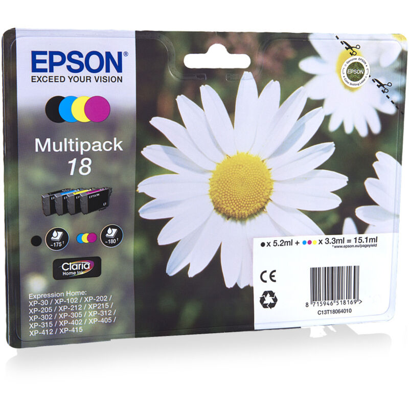Epson T18 Multipack Original (4)Multipack Daisy 18Contenuto della confezione: 1x nero T1801 (5,2 ml), 1x rosso T1803 (3,3 ml), 1x blu T1802 (3,3 ml) e 1x giallo T1804 (3,3 ml) Adatto per: Epson Expression XP102, 202, 205, 302, 305, 402 e 405, tra gli altri Versione: originale